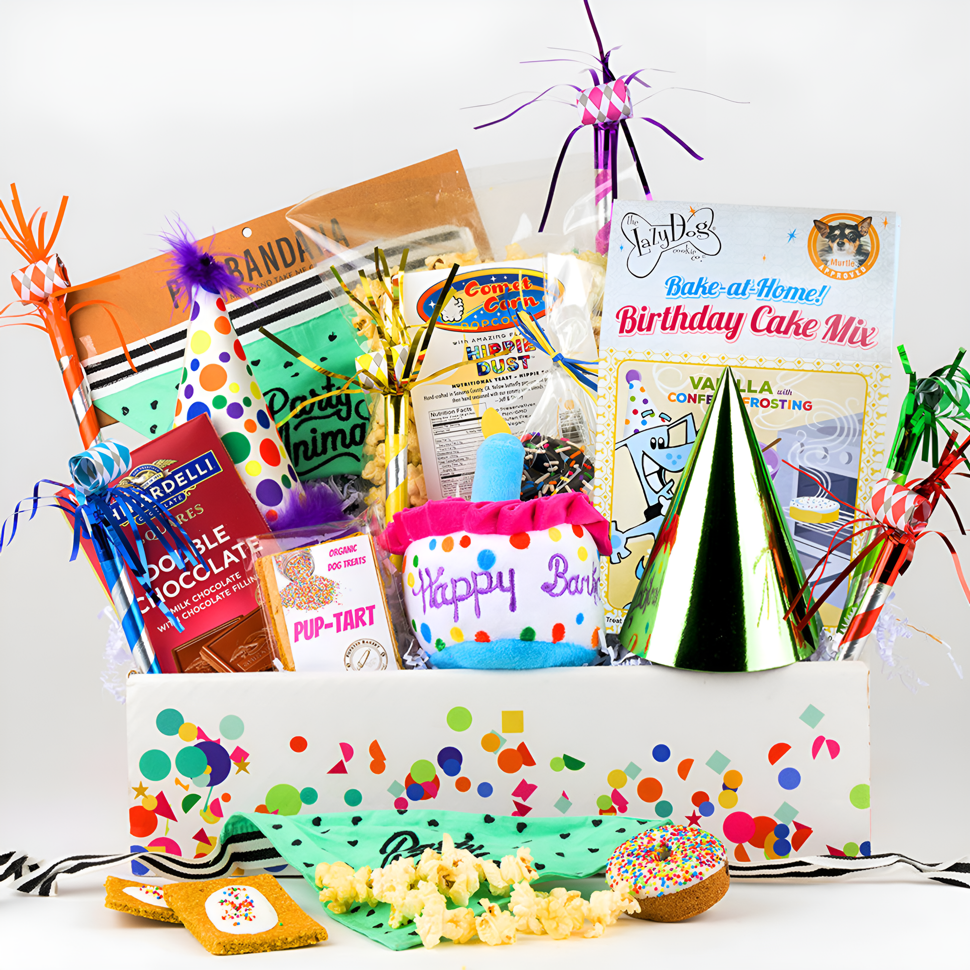 Celebrate the joy of birthdays with your favorite dog-loving friends and their furry companions! This heartwarming gift is the perfect way to say "Happy Birthday!" to your loved ones or their pups. Whether it's a human or a canine milestone, like a Birthday, Gotcha Day, or just another year of shared adventures, express your affection by sending a birthday treat for both the dog owner and their furry friend! A truly unique gift for dog owners and their pups to enjoy a birthday celebration together! For the humans, revel in the birthday spirit with delightful popcorn, a scrumptious chocolate bar, and festive party accessories like a party hat and blowers. Meanwhile, your pup gets to join in the fun with a plush birthday cake toy, a stylish party hat, a 'Party Animal' bandana, a Pup-tart baked treat, and a sprinkled donut baked treat. It's a celebration for both the birthday VIP and their beloved furball!