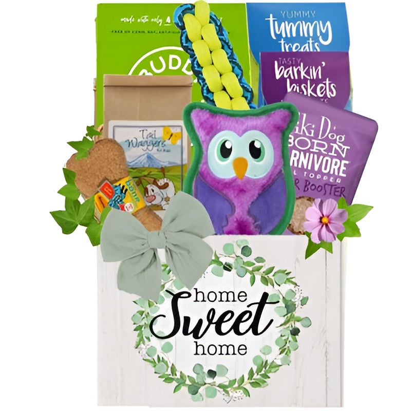 Cheers! Mark the occasion of your furry friend's new abode with the Homeward Bound Dog Gift. Bursting with whimsical playthings and delectable goodies, it's an ideal present for welcoming a new four-legged addition to the family or spoiling a beloved member who's moved to a new pad.